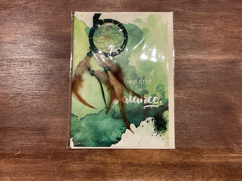 Inspirational greeting card with green watercolour card design and attached with a handmade 2" green dream catcher.