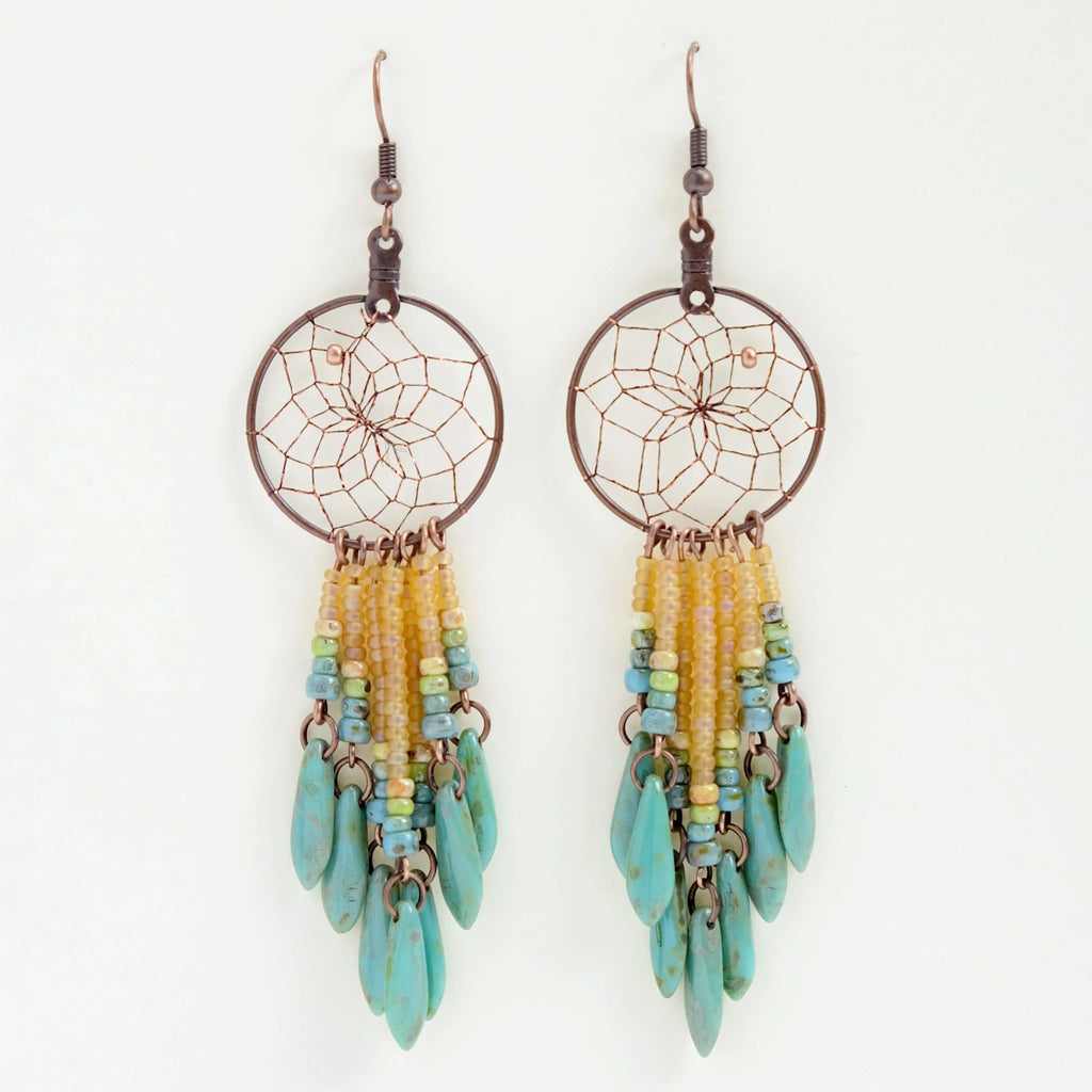 Handwoven dream catcher web jewellery beautifully decorated with glass daggers and beads. Casual and contemporary dream catcher jewellery.