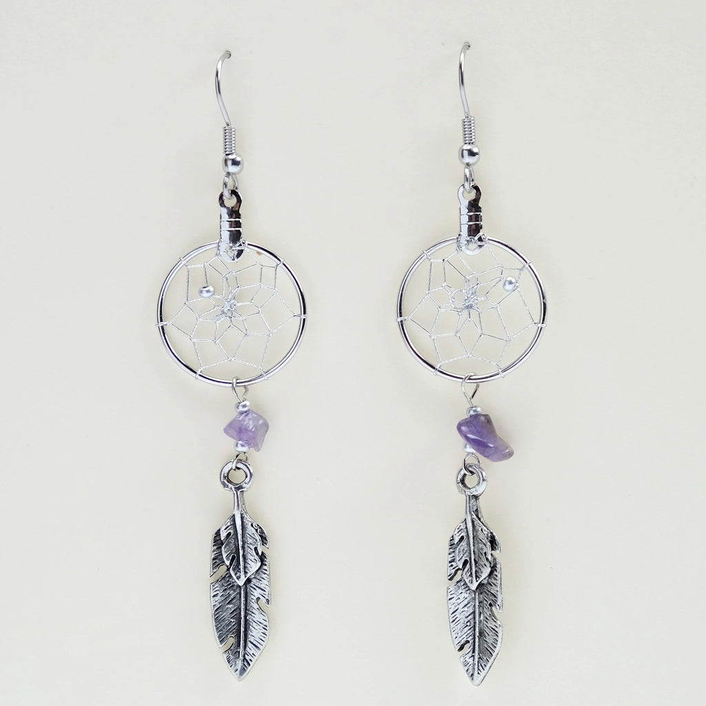 Handwoven dream catcher jewellery detailed with semi-precious stones and metal double feather charm. Dream Catcher ring size is .75"