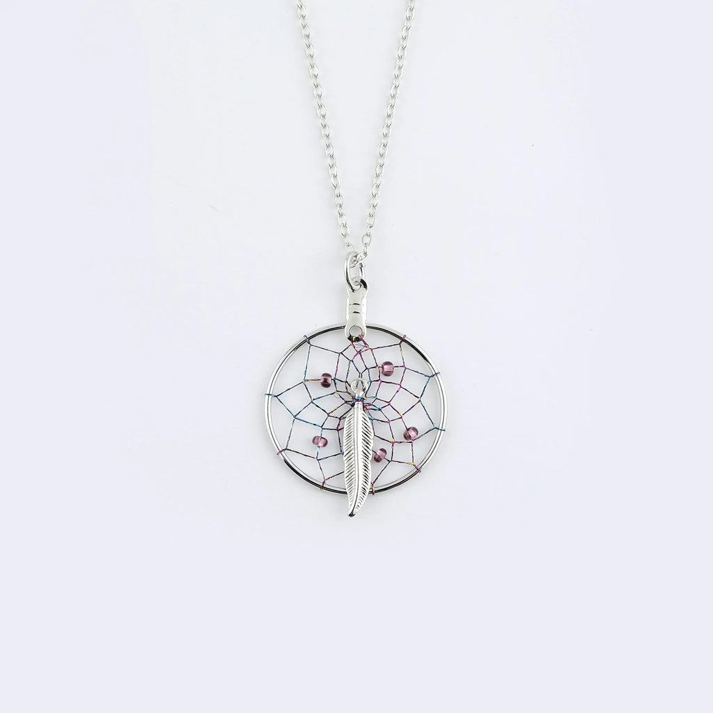 Handmade Dream Catcher jewellery, detailed with a metal feather in the middle of the web and purple glass beads. Dream Catcher ring size is 1". Necklace Length is 18".