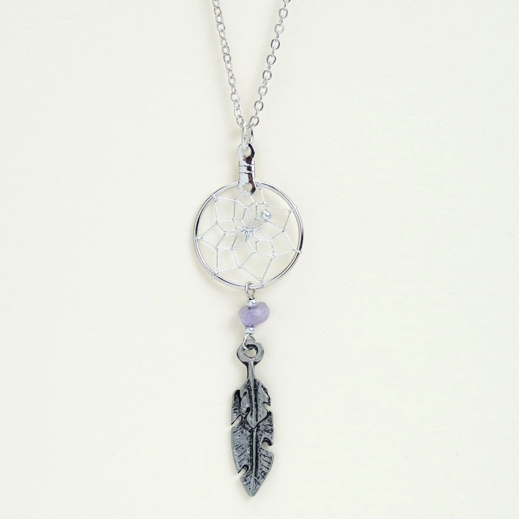 Handwoven dream catcher jewellery detailed with semi-precious stones and metal double feather charm. Dream Catcher ring size is .75". Necklace Length is 18".