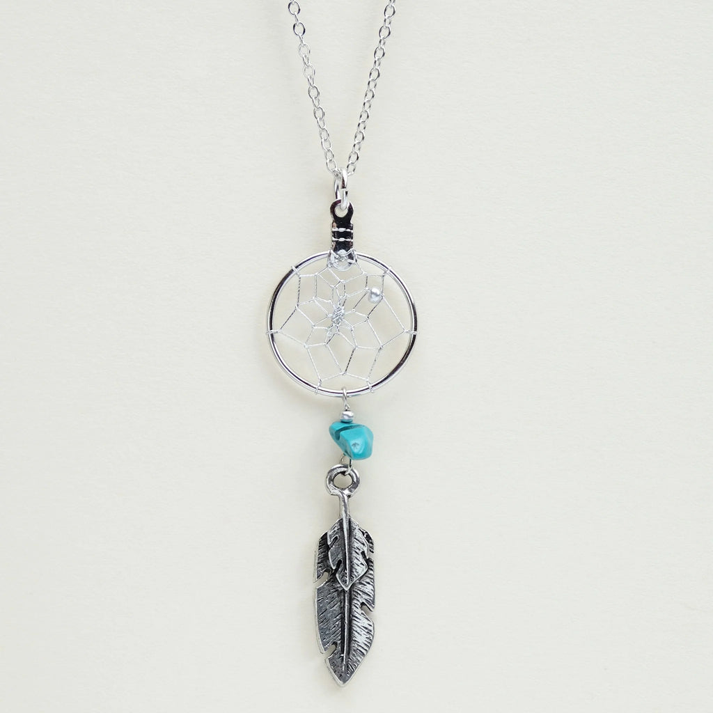 Handwoven dream catcher jewellery detailed with semi-precious stones and metal double feather charm. Dream Catcher ring size is .75". Necklace Length is 18".