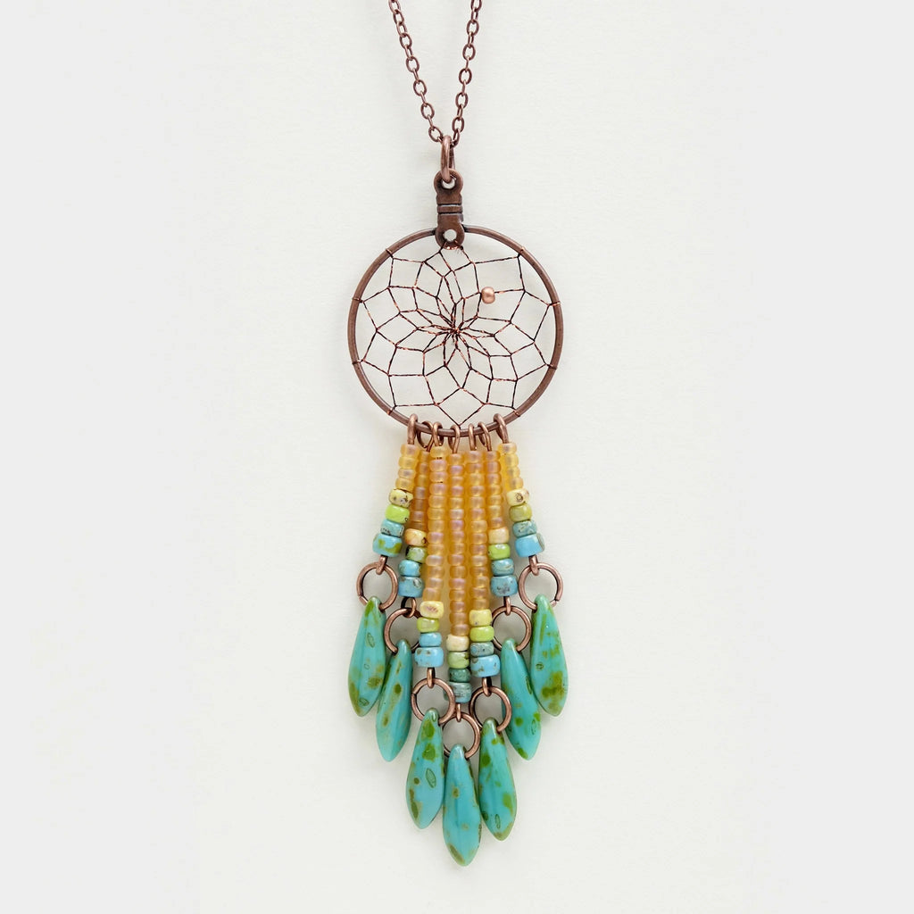 Handwoven dream catcher web jewellery beautifully decorated with glass daggers and beads. Casual and contemporary dream catcher jewellery.
