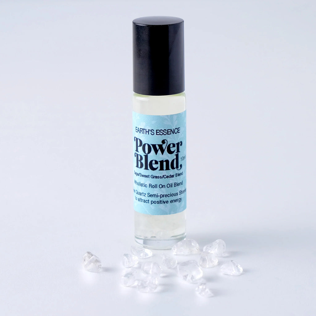 Earth's Essence Power Blend Healing Roll On Oil Blend comes supercharged with Clear Quartz semi-precious stones to enhance positive energy. A unique blend of cedar, sage, and sweet grass.