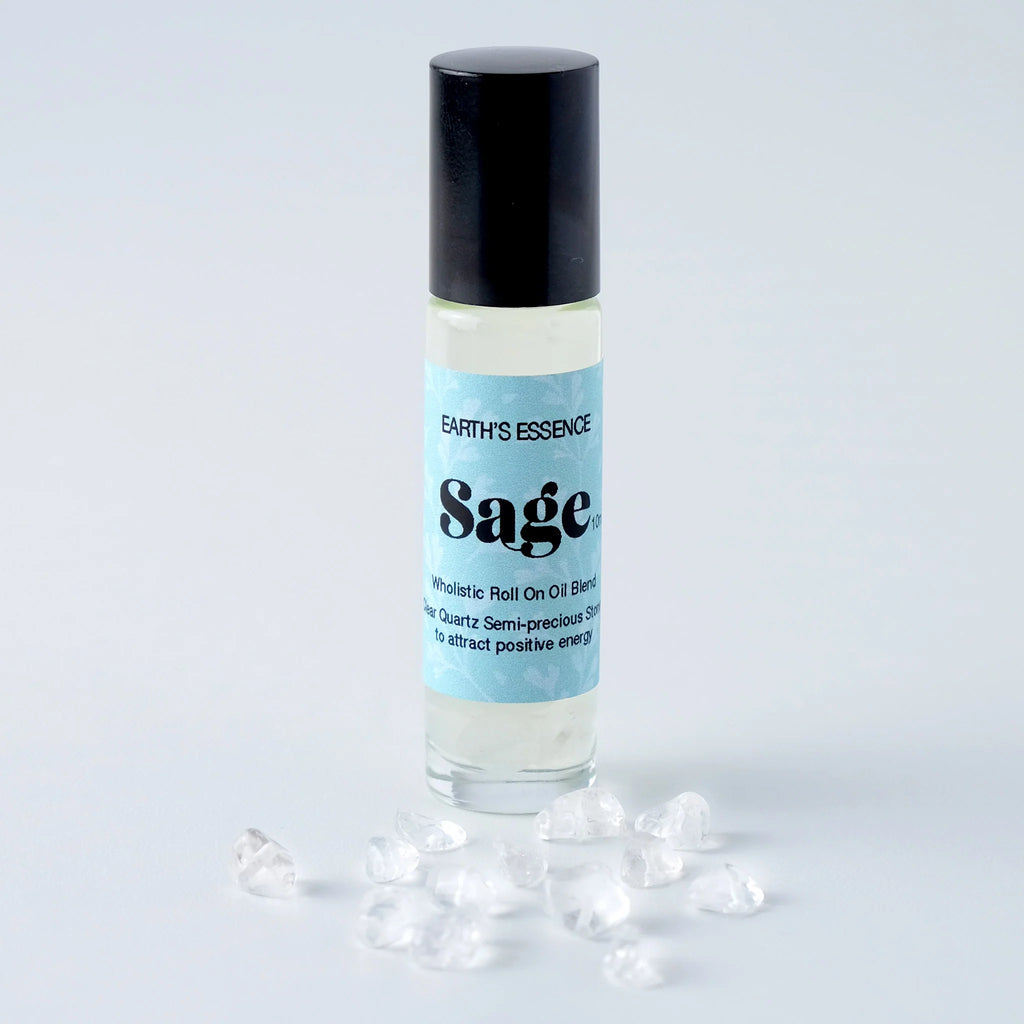 Earth's Essence Sage Healing Roll On Oil Blend comes supercharged with Clear Quartz semi-precious stones to enhance positive energy.