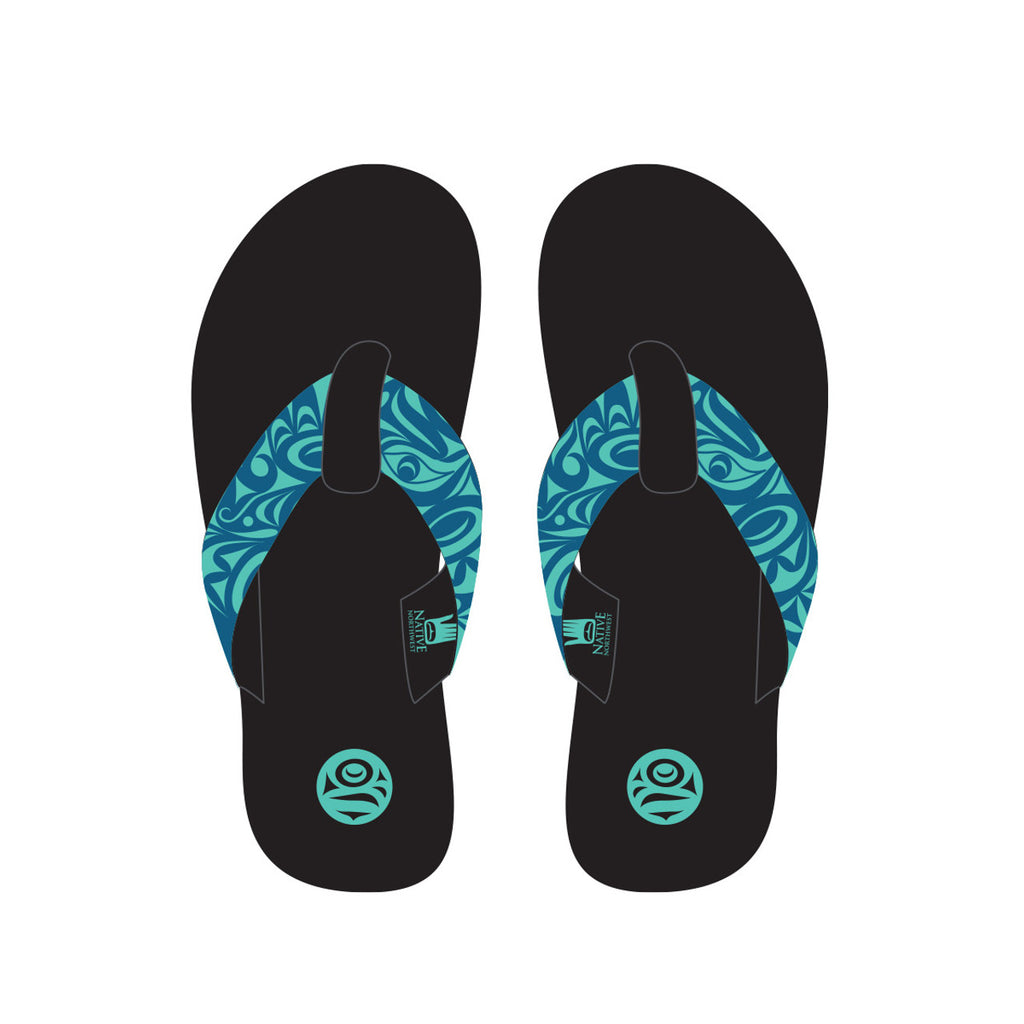 Bold blue flip flops featuring Salish Eagle Design. Perfect for a day at the beach!