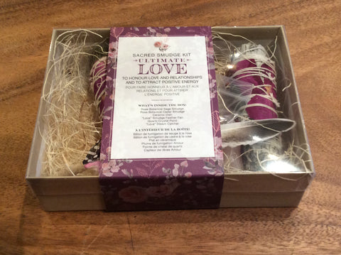 Includes: Rose botanical sage smudge, rose botanical cedar smudge, ceramic dish, “love” smudge feather fan, quartz crystal point and “love” dreamcatcher