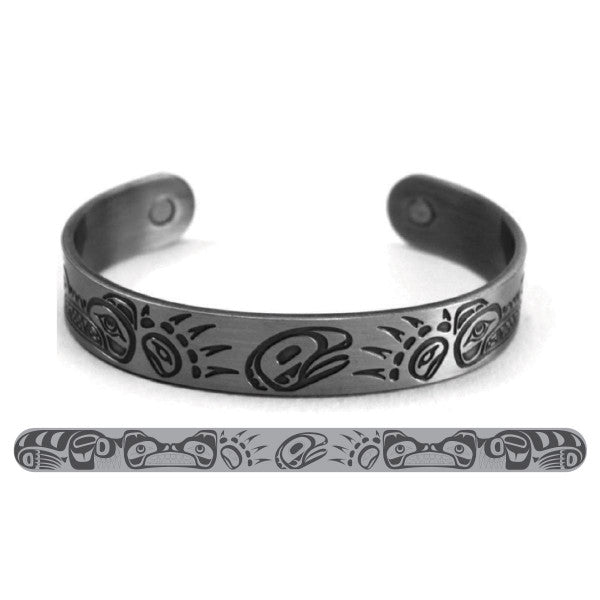 Clean, strong and modern best describe this0.5 inch wide open cuff bracelet in brushed silver. A piece you'll want to put on everyday forever. The outer band features engraved artwork - Bears by Haisla, Heiltsuk artist, Paul Windsor.
