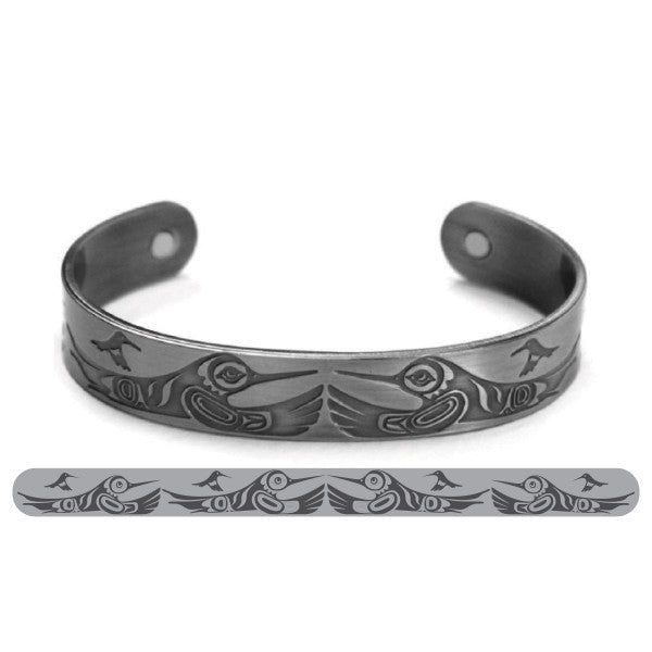 Clean, strong and modern best describe this 0.5 inch wide open cuff bracelet in brushed silver. A piece you'll want to put on everyday forever. The outer band features engraved artwork - Hummingbirds by Haisla, Heiltsuk artist, Paul Windsor.